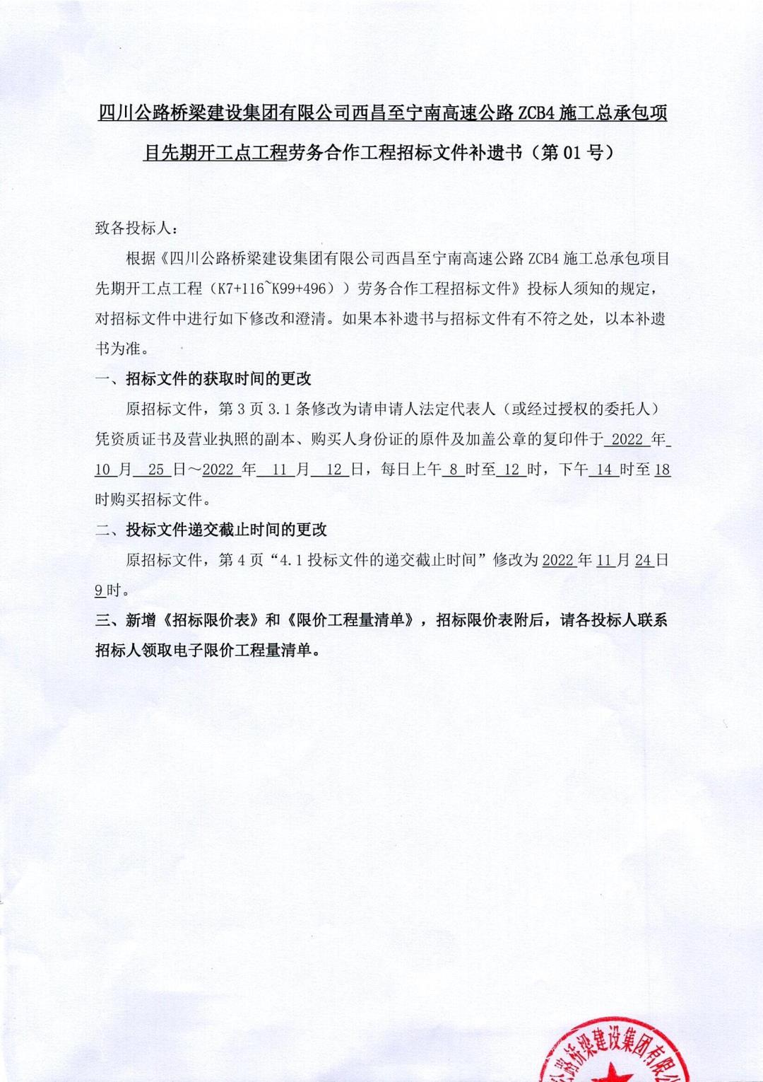 西昌至宁南高速公路ZCB4施工总承包项目先期开工点工程劳务合作工程招标文件补遗书(第01号)